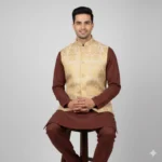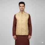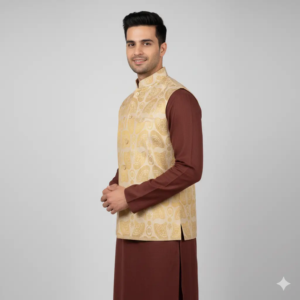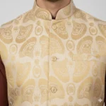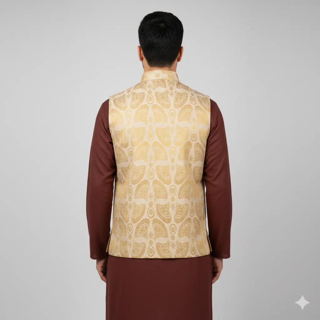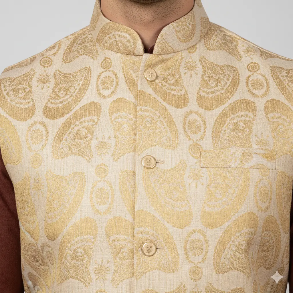 Radiate royalty with the Swarna Vastra Jacket. Crafted in a luxurious golden jacquard weave on a beige base, this Modi jacket blends heritage motifs with regal shimmer. Perfect for weddings, receptions, and festive soirées, it’s a showstopper that speaks the language of tradition in gold.