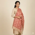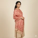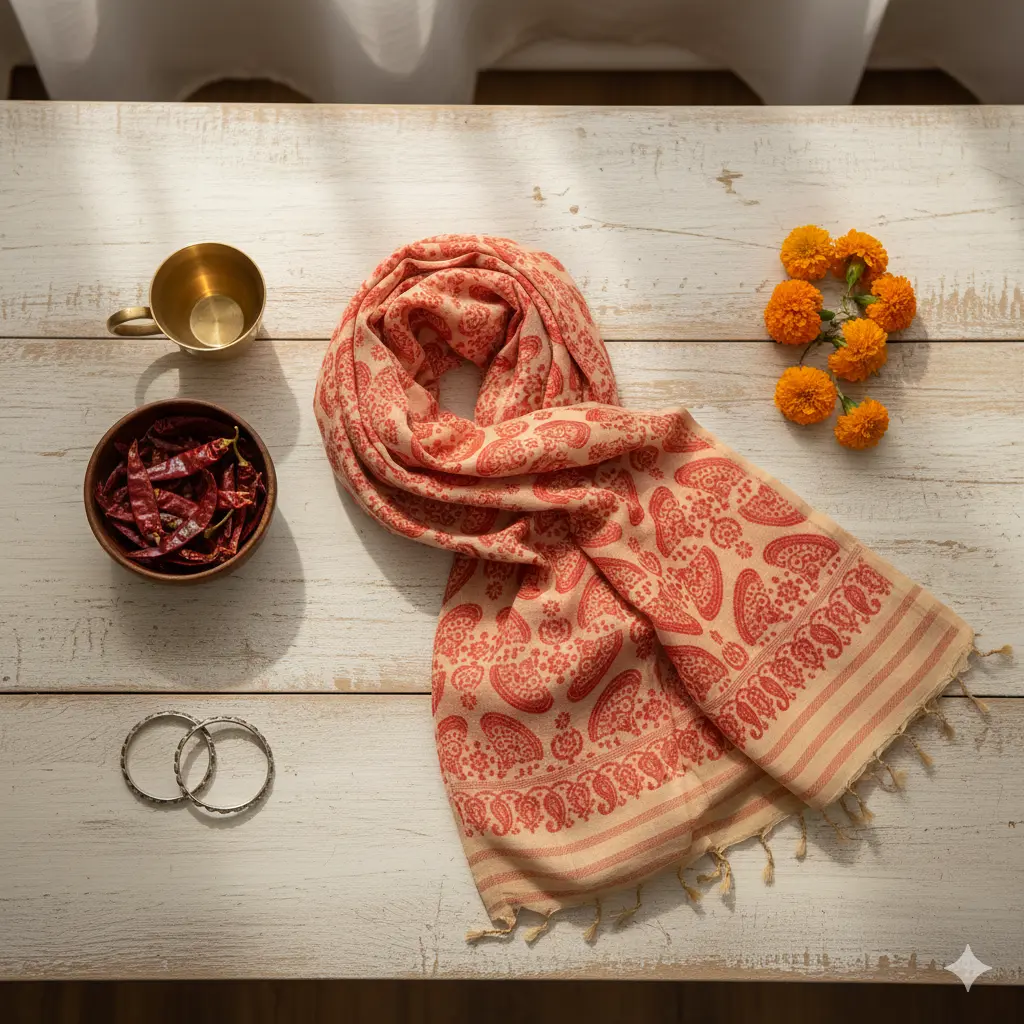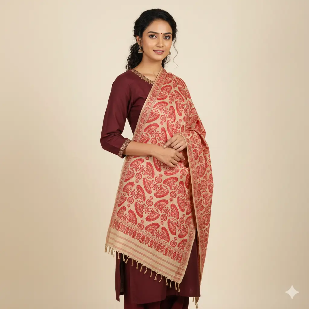 Unfold stories of tradition with the Crimson Mandala Drape. Inspired by mandala artistry, this shawl features a rhythmic pattern of semi-circular blooms and delicate latticework, all handwoven in earthy tones of red and beige. Lightweight, stylish, and deeply rooted in culture