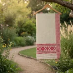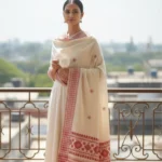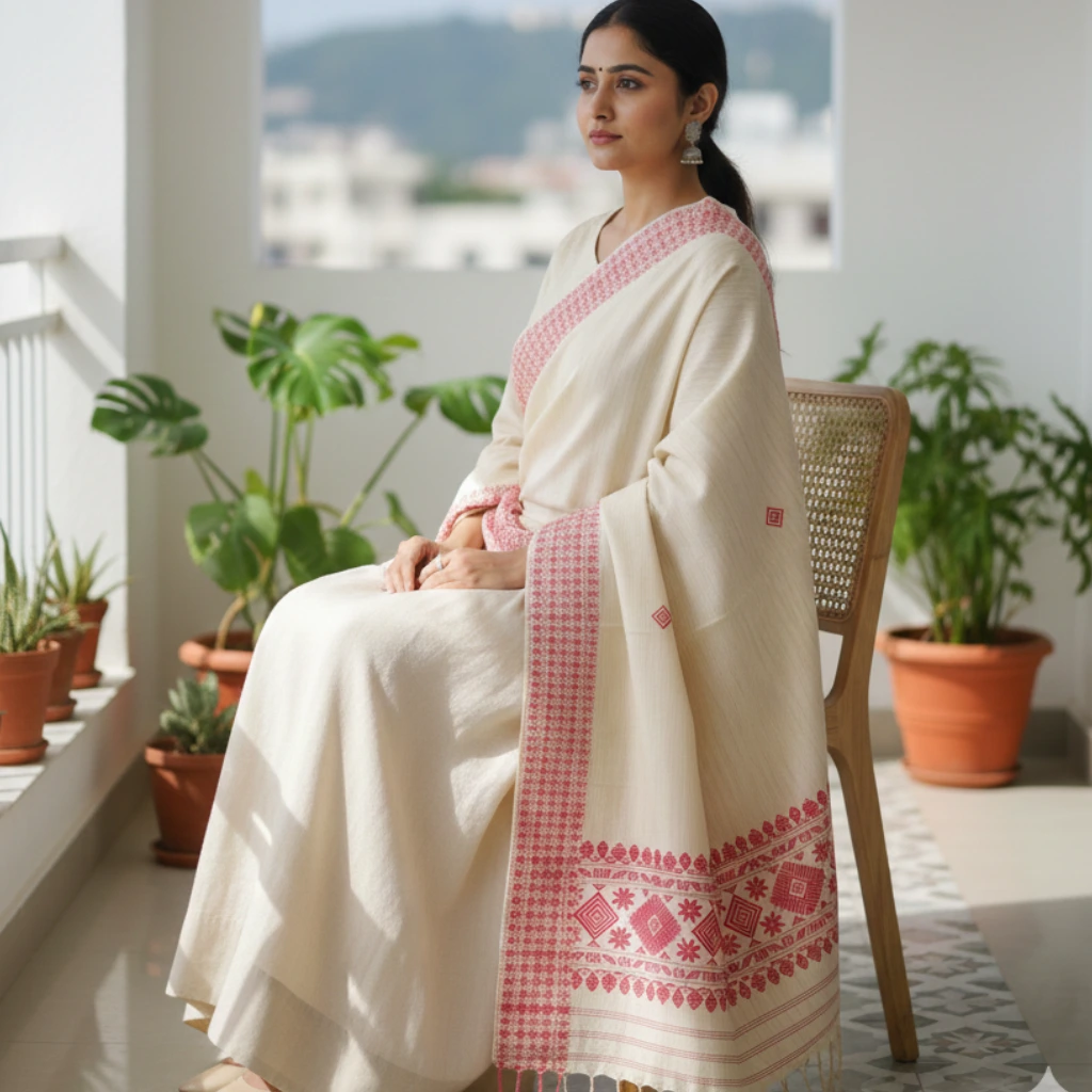Every thread hums a melody in the Geetanjali Threads Shawl. This elegant piece is adorned with rhythmic diamond and floral patterns in classic red against a beige base, creating a poetic harmony of design and culture. A timeless accessory for festive grace or everyday luxury.