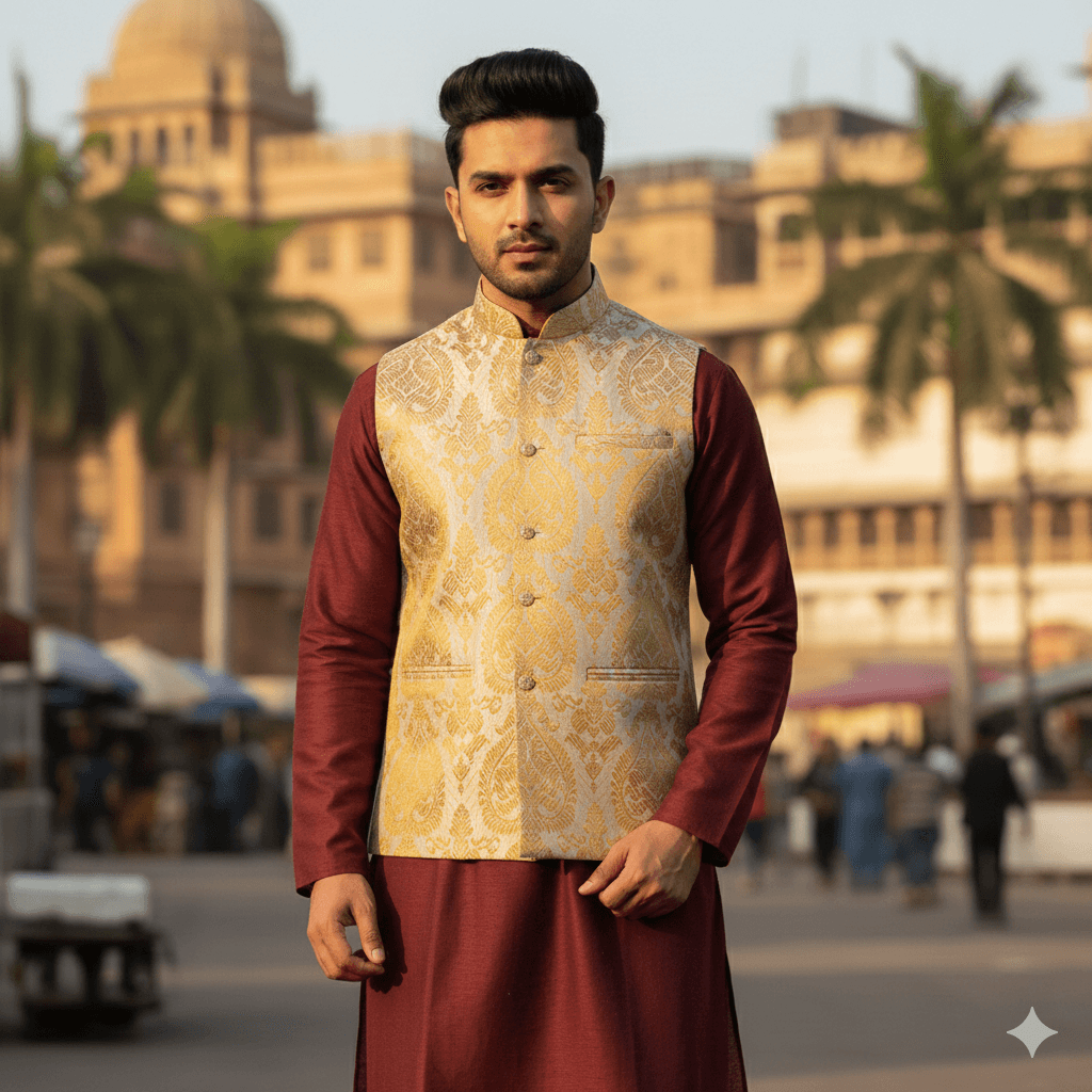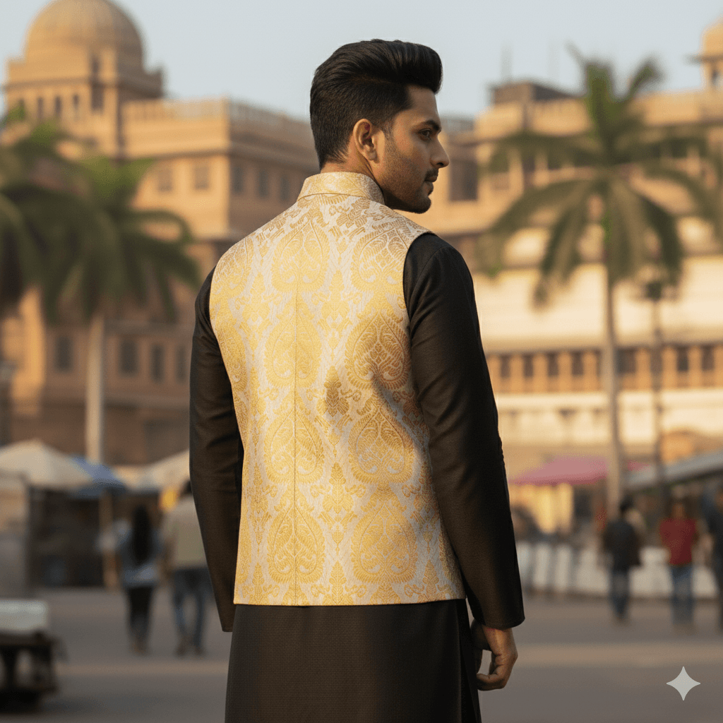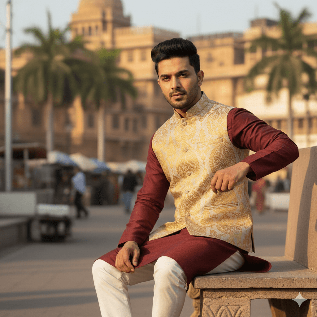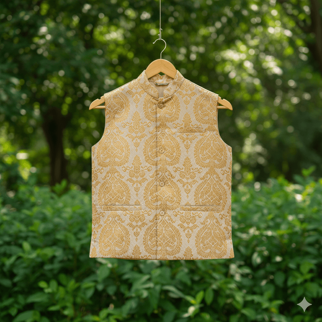 The Zari Zest Classic is where ethnic elegance meets modern finesse. Intricately woven golden motifs glow subtly over a textured beige base, making this Modi jacket an ideal pick for groomsmen, festive parties, or upscale cultural events. Tradition never looked so refined.