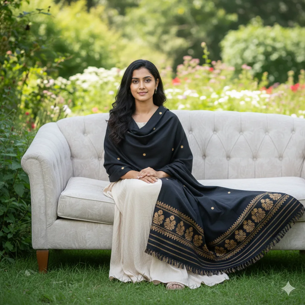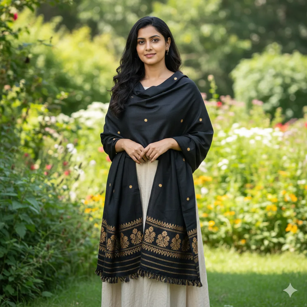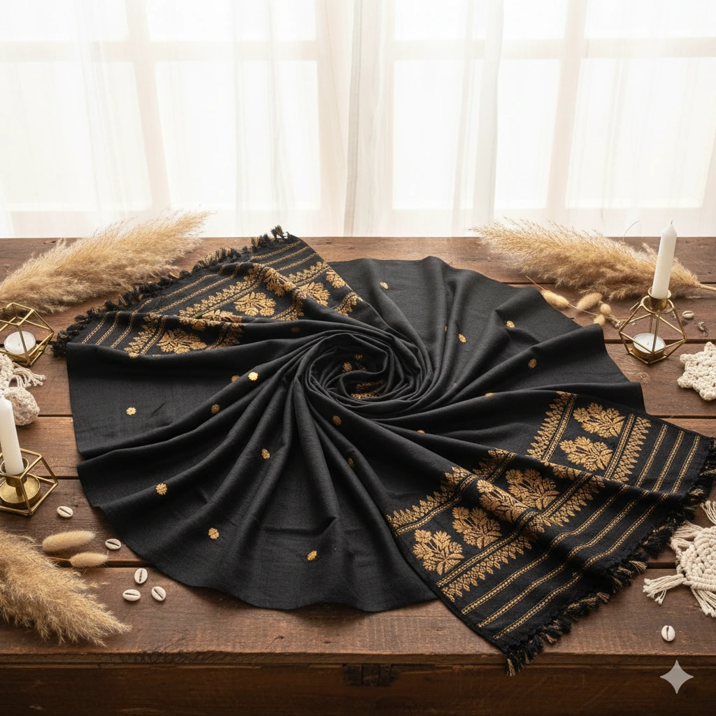 The Golden Bloom Shawl captures the essence of handwoven charm with intricate floral bursts across a deep black. Each petal tells a story of artisan mastery, making this a statement piece for both tradition lovers and trendsetters.