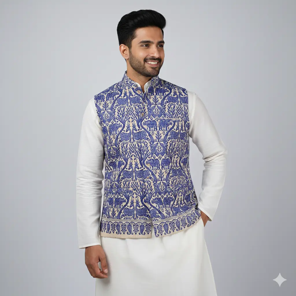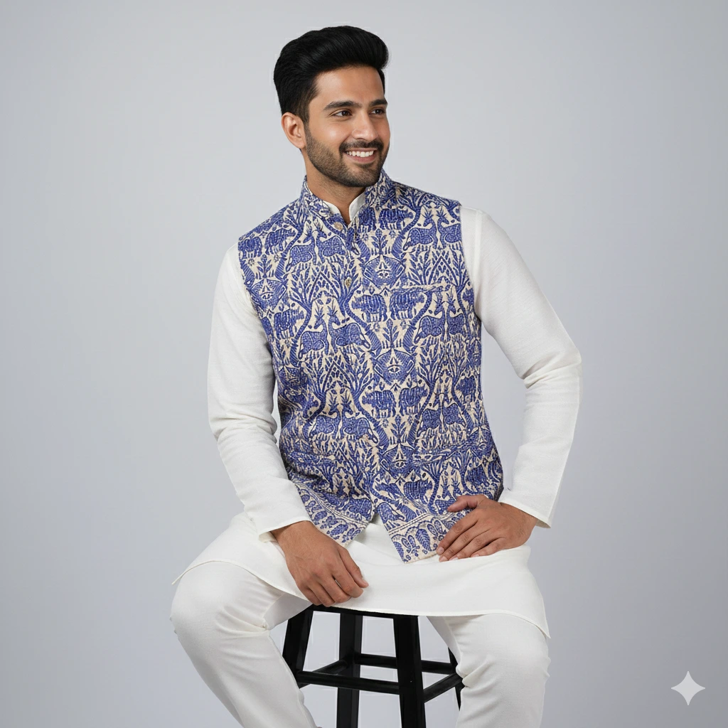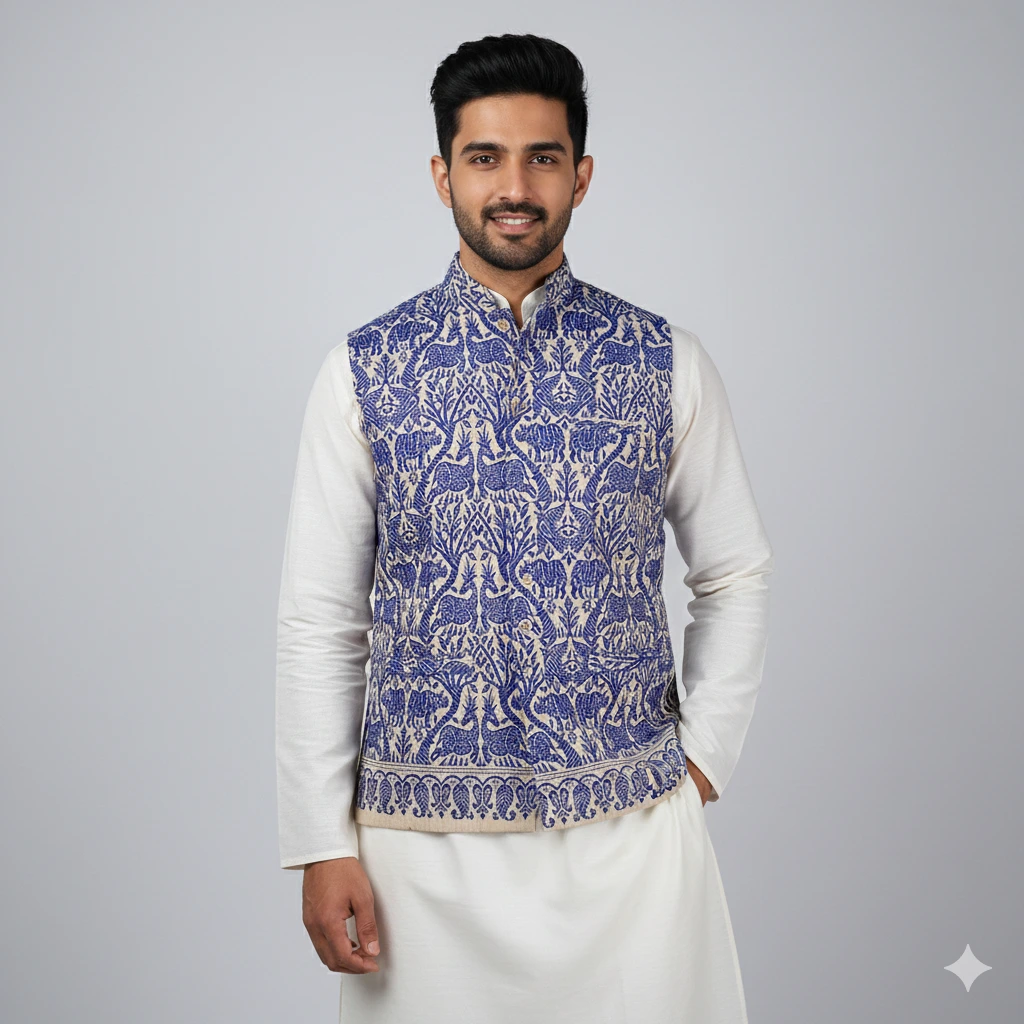 Bold, royal, and rooted in heritage—the Blue Baagh Jacket features majestic tigers, graceful deer, and leafy patterns in a striking indigo tone on earthy beige. This Modi jacket reflects the courage of the wild and the beauty of Indian craft, making it ideal for festive or semi-formal ethnic occasions.