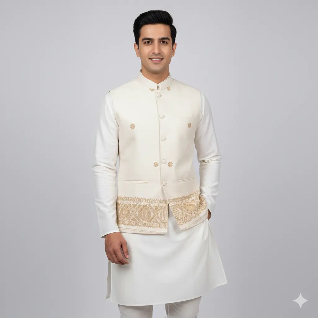 Crafted from luxurious Eri silk, Eri Ivory Grace is an ode to elegance in its purest form. The natural cream hue, smooth texture, and delicate embroidered accents reflect refined taste and traditional sophistication. Ideal for weddings, spiritual events, and cultural celebrations.