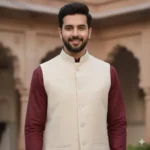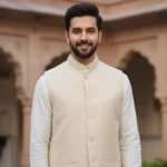 The Maharaja Ivory Jacket captures the grandeur of India’s silk heritage. Woven from premium Eri and Tassar silk, it offers a refined drape, soft feel, and subtle shine. Ideal for grooms, festive ceremonies, or upscale ethnic styling.