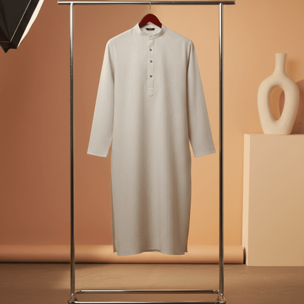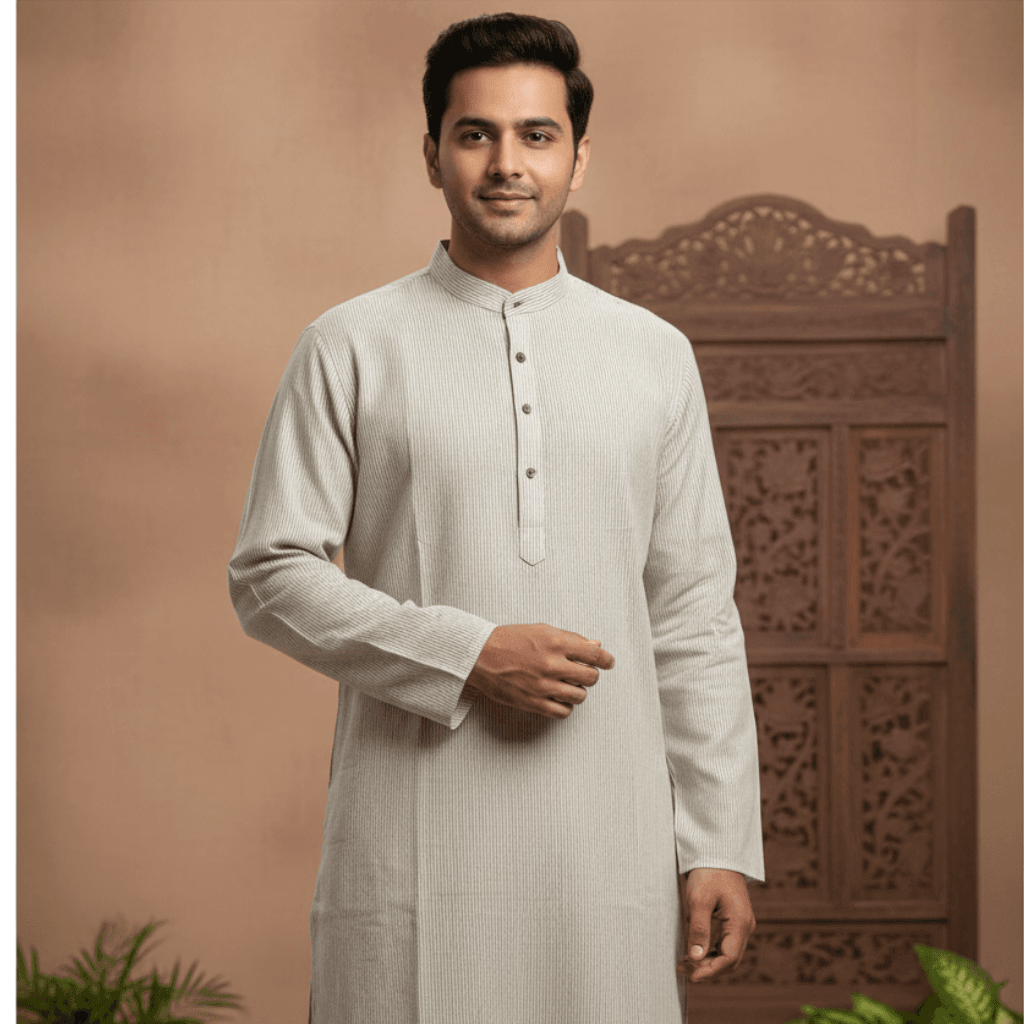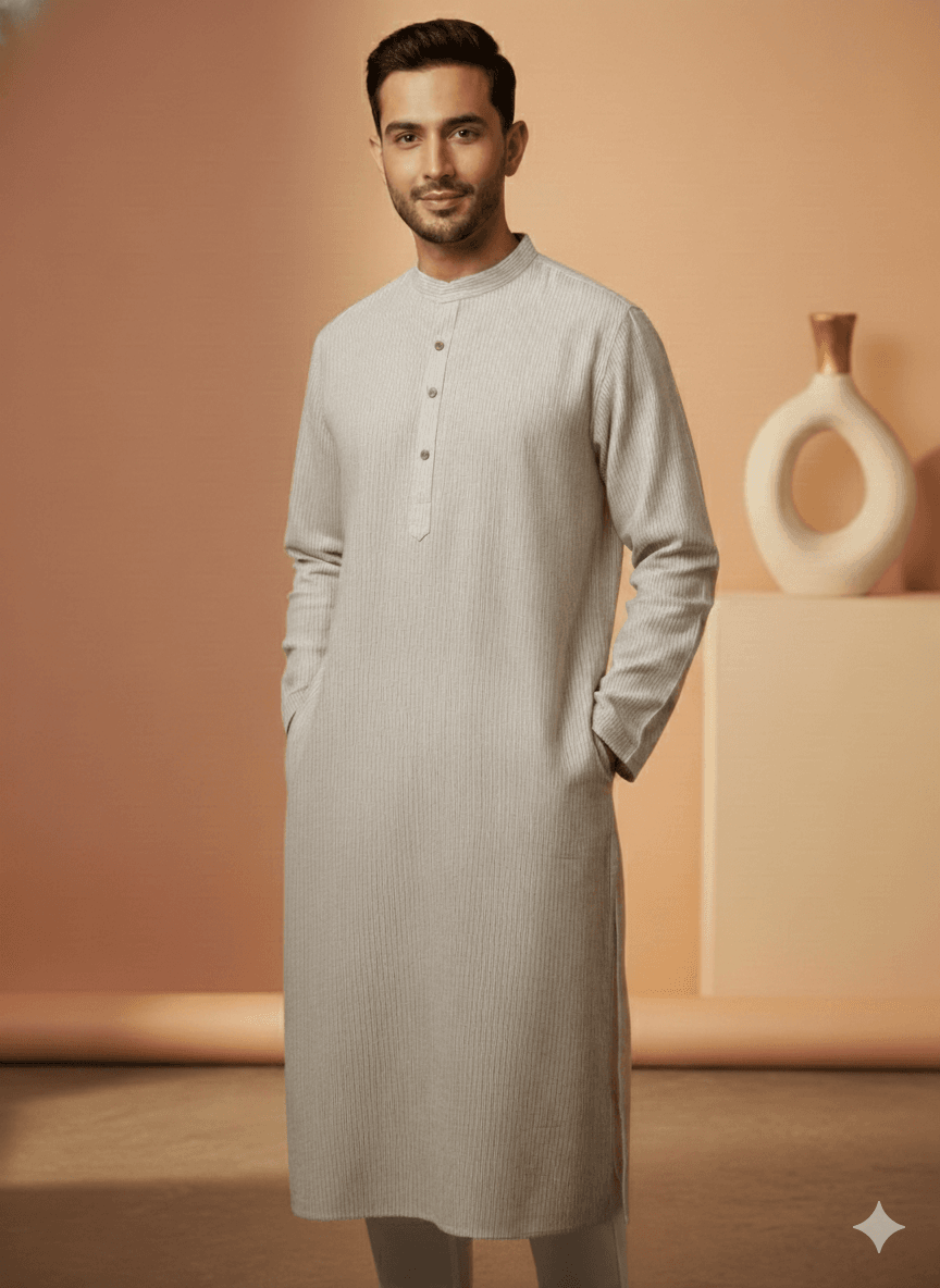 Experience pure elegance with the Ivory Classic Cotton Kurta. Crafted from soft, breathable cotton, this kurta brings timeless simplicity to your wardrobe. The subtle vertical texture and minimal button placket give it a refined, versatile look—perfect for festive occasions, office wear, or everyday comfort.