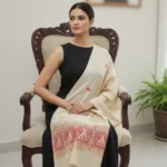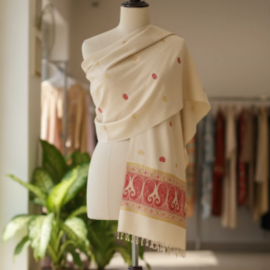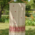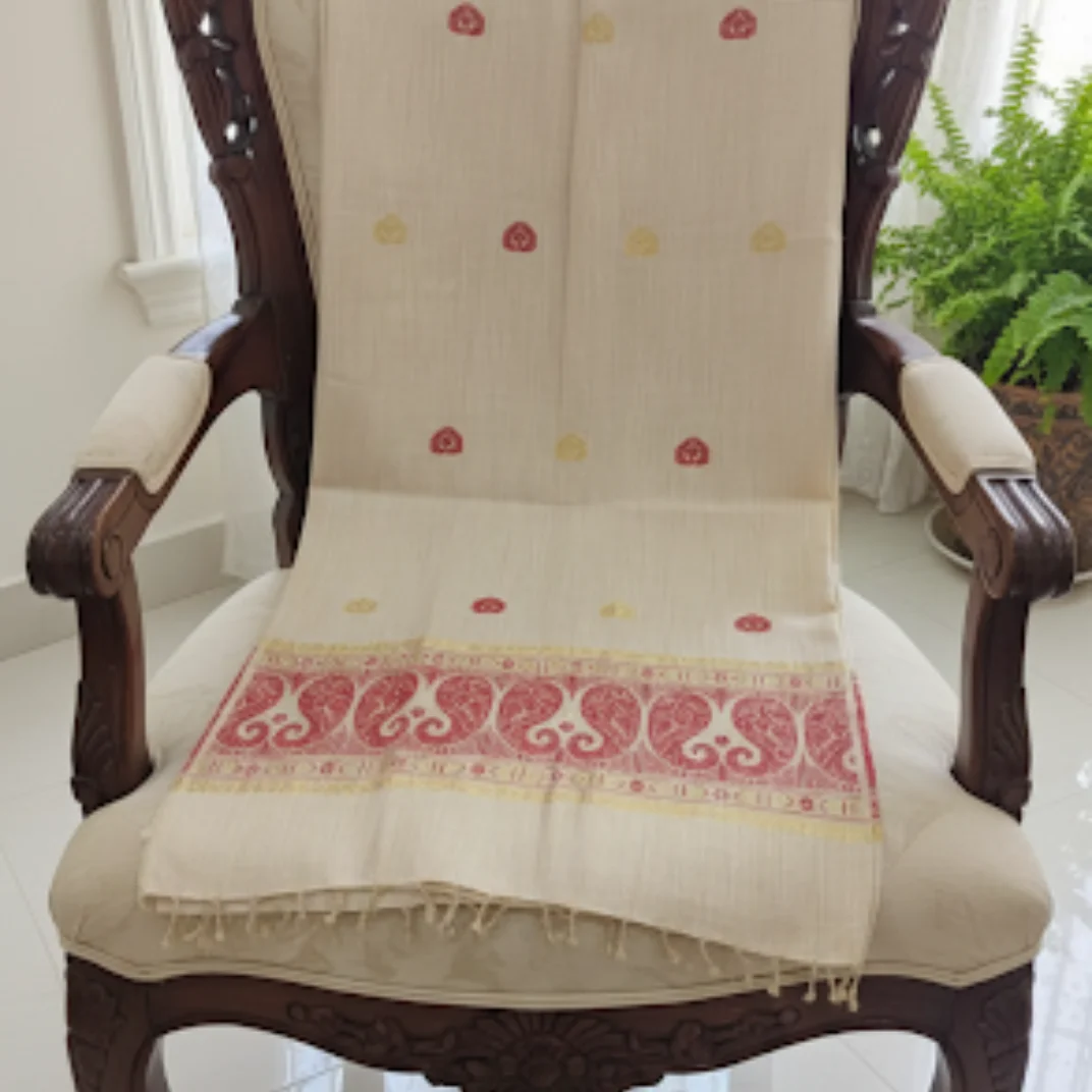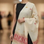 Elegant and rooted in tradition, the Gaurangi Heritage Stole showcases the beauty of handloom craftsmanship. The soft ivory base is adorned with delicate woven motifs and a rich, intricately designed border, making it a perfect blend of cultural charm and modern grace.