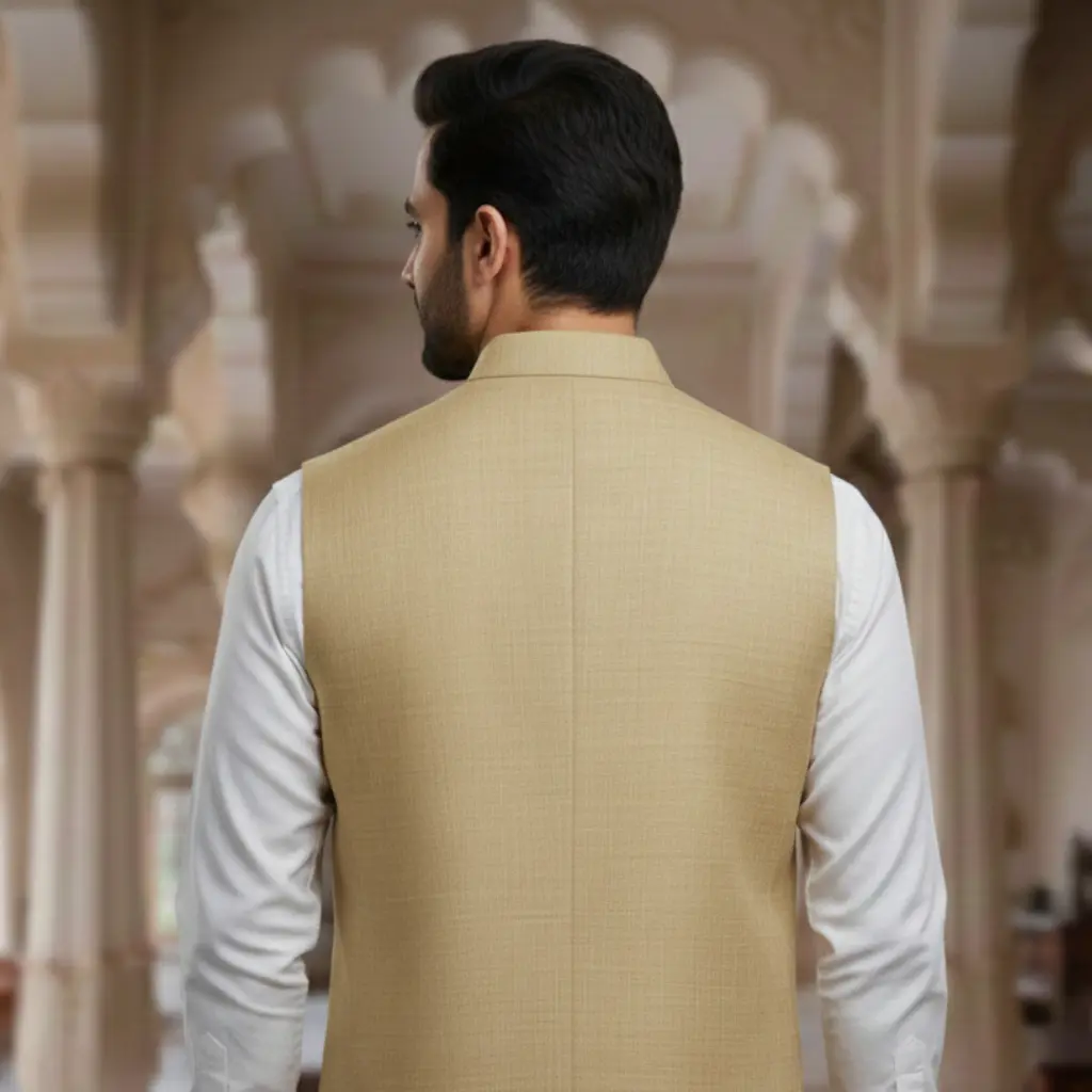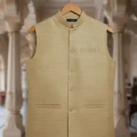 Step into timeless elegance with the Royal Muga Heritage Jacket, handcrafted from authentic Assam Muga silk. Its natural golden-beige sheen, classic mandarin collar, and minimalistic detailing make it the perfect blend of heritage and modern sophistication. Ideal for weddings, festive occasions, or cultural events.