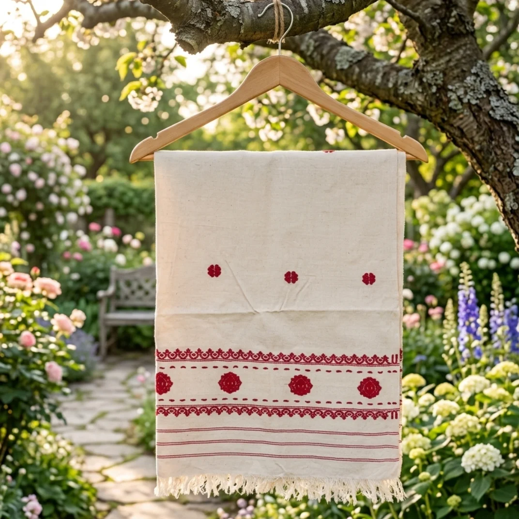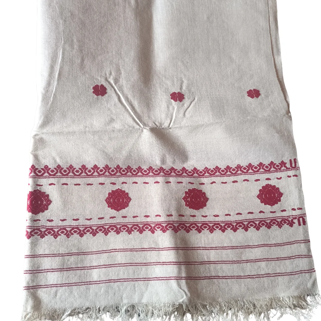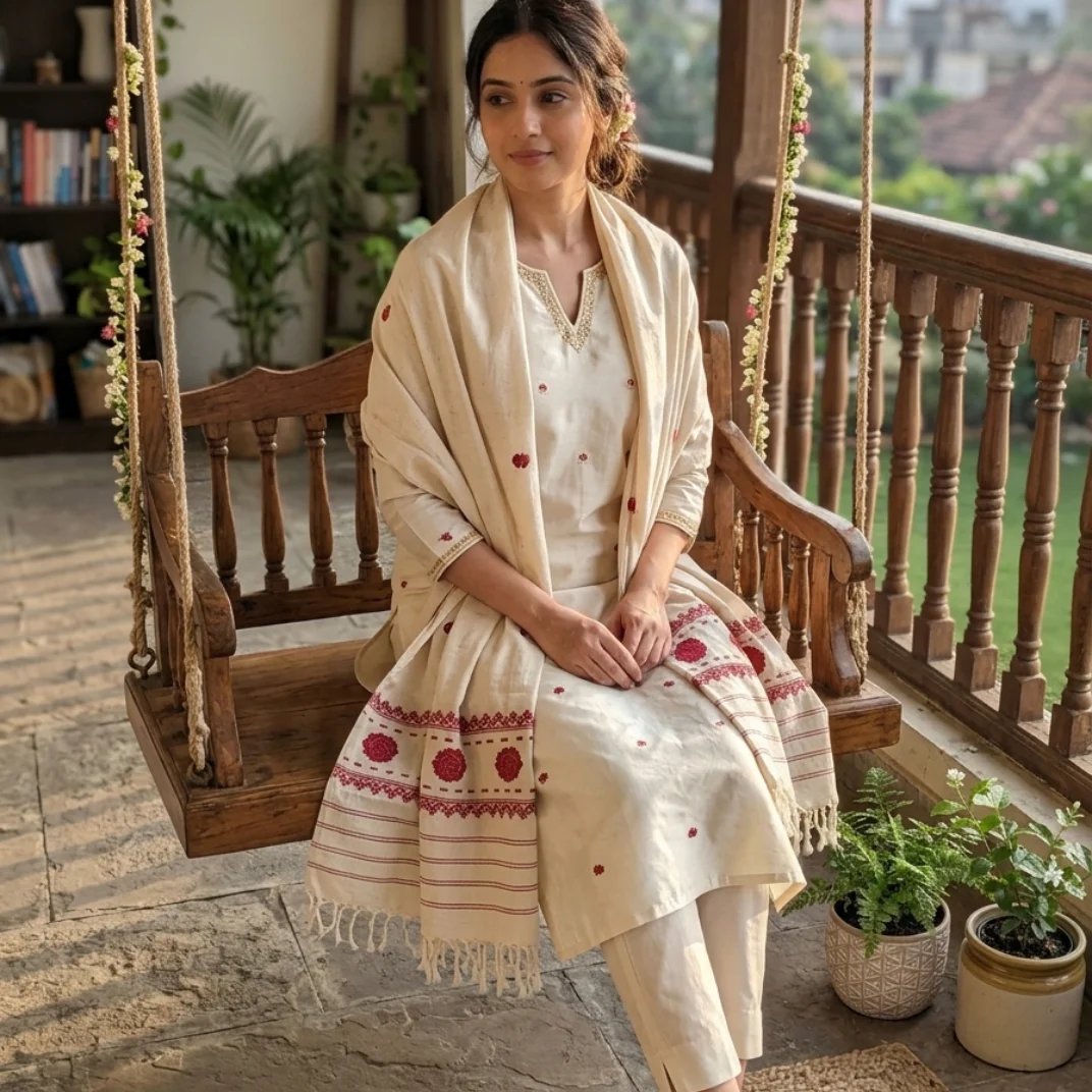 A graceful expression of simplicity and tradition, the Ivory Blossom Eri Silk Shawl features a soft natural ivory base adorned with delicate red floral motifs. Handwoven in pure eri silk, it offers a luxurious drape with a warm, breathable feel—perfect for timeless elegance in every season.