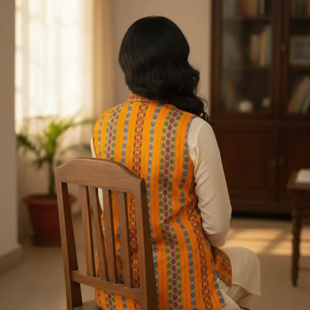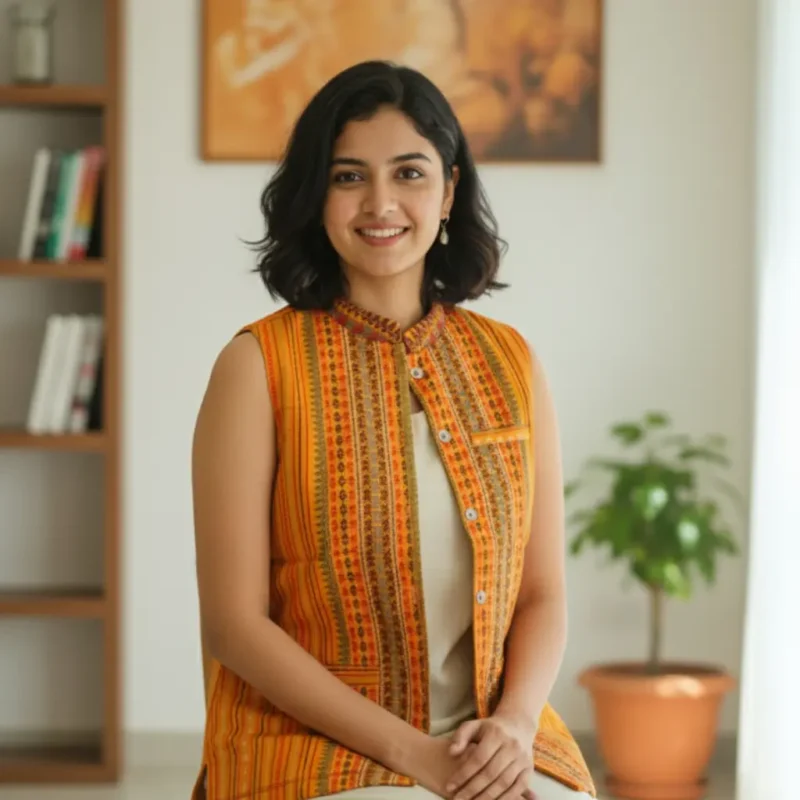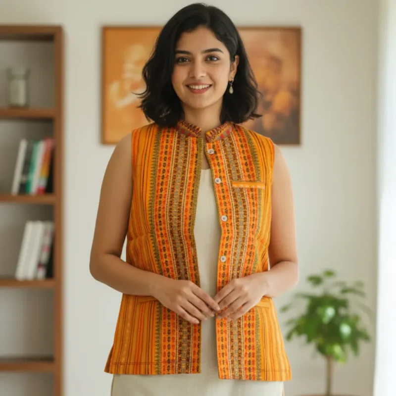 Experience the elegance of Northeast craftsmanship with the Maniraang Heritage Manipuri Jacket. Handwoven in vibrant hues of orange, red, and green, this sleeveless jacket showcases traditional motifs that celebrate Manipuri artistry. Lightweight, stylish, and culturally rich—perfect for pairing with kurtas, dresses, or western wear for a bold ethnic-fusion look.