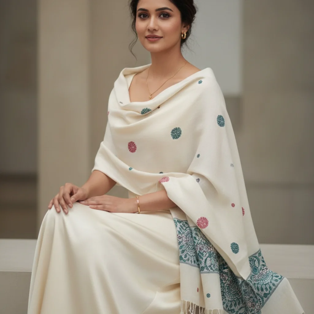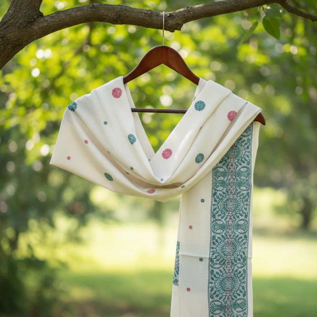 Soft as a breeze and elegant as nature itself, the Meadow Muse Handloom Shawl features delicate multicolored motifs scattered across an ivory base, complemented by an intricate green woven border. It offers breathable warmth with a graceful drape—perfect for effortless everyday sophistication.