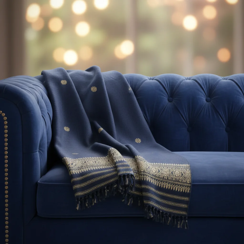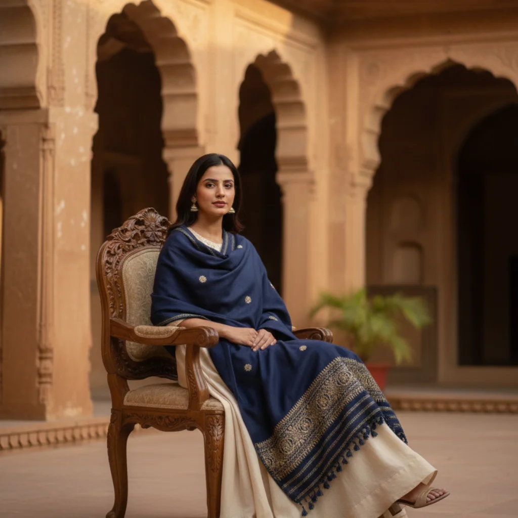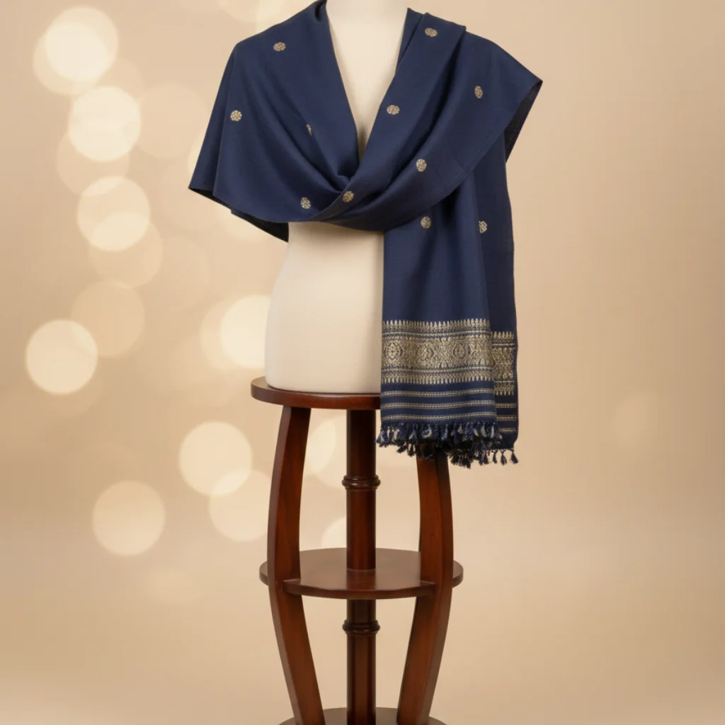 Feel like royalty in the Rajasi Drape, a majestic shawl featuring a deep navy base enhanced by detailed gold weaving. The symmetrical design, resembling royal palace artistry, makes this piece an elegant companion for both traditional attire and contemporary fashion.