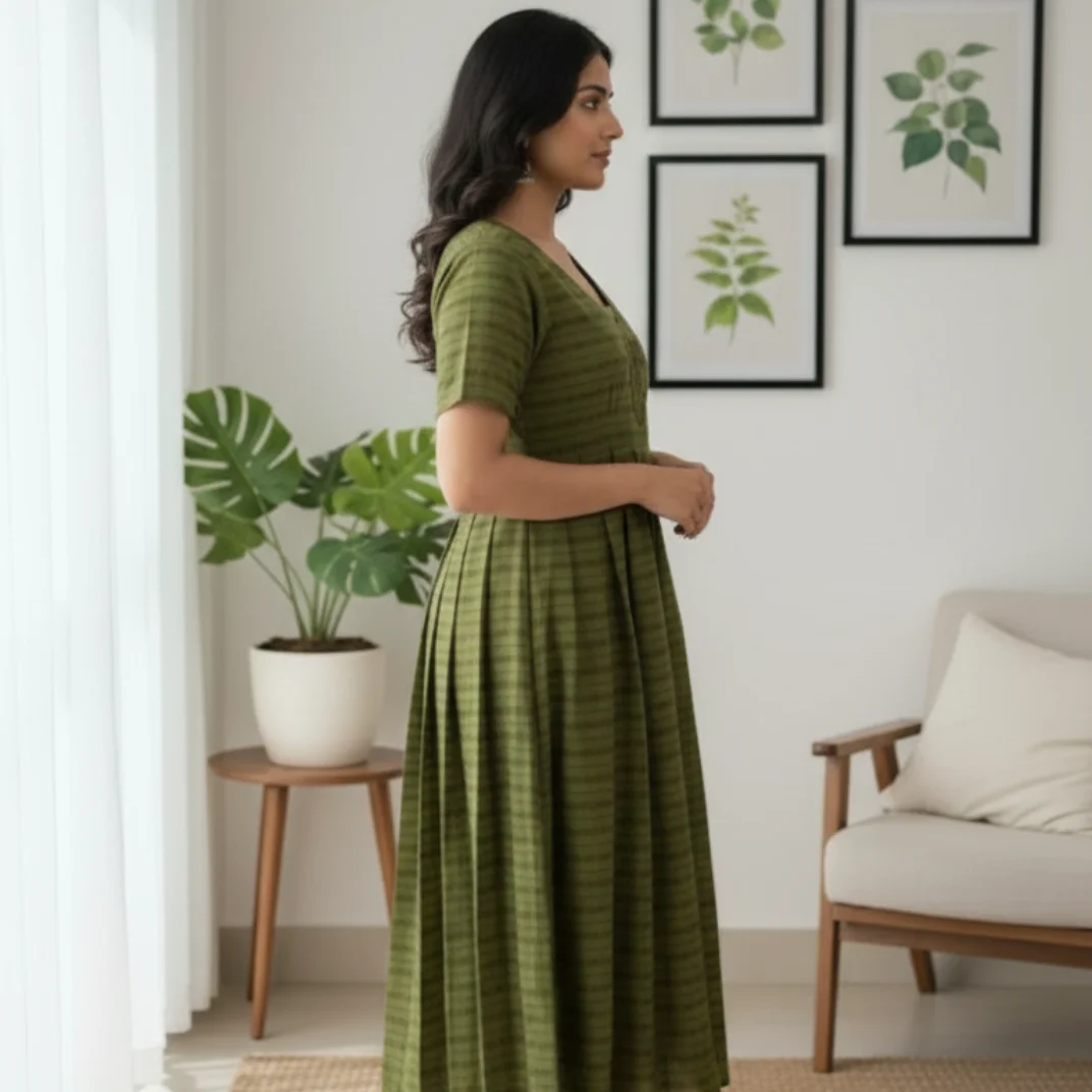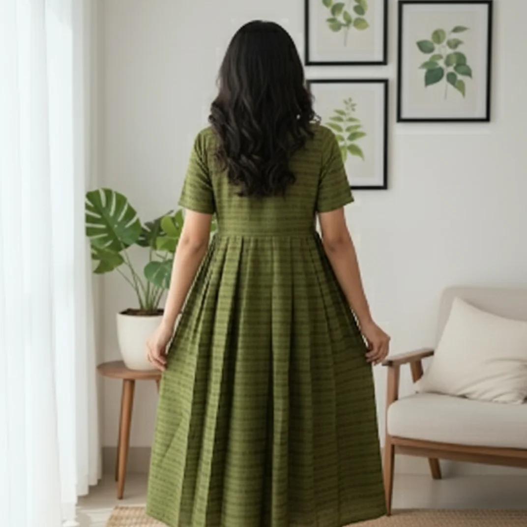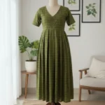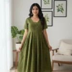 Graceful and refreshing, the Olive Meadow Cotton Frock captures the charm of nature with its soothing green hue and delicate woven texture. Crafted from breathable cotton, this ankle-length frock features a softly gathered silhouette that offers comfort and effortless elegance—perfect for casual outings, brunch dates, or relaxed festive days.