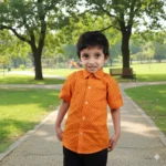 Sweet as a ladoo and bright as a bloom, the Ladoo Bloom shirt is a festival favorite. The golden-orange fabric dotted with charming maroon tear-drop patterns gives it a festive ethnic touch, while the soft texture ensures all-day comfort for playful spirits.