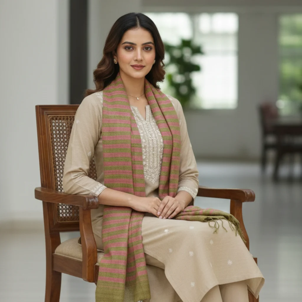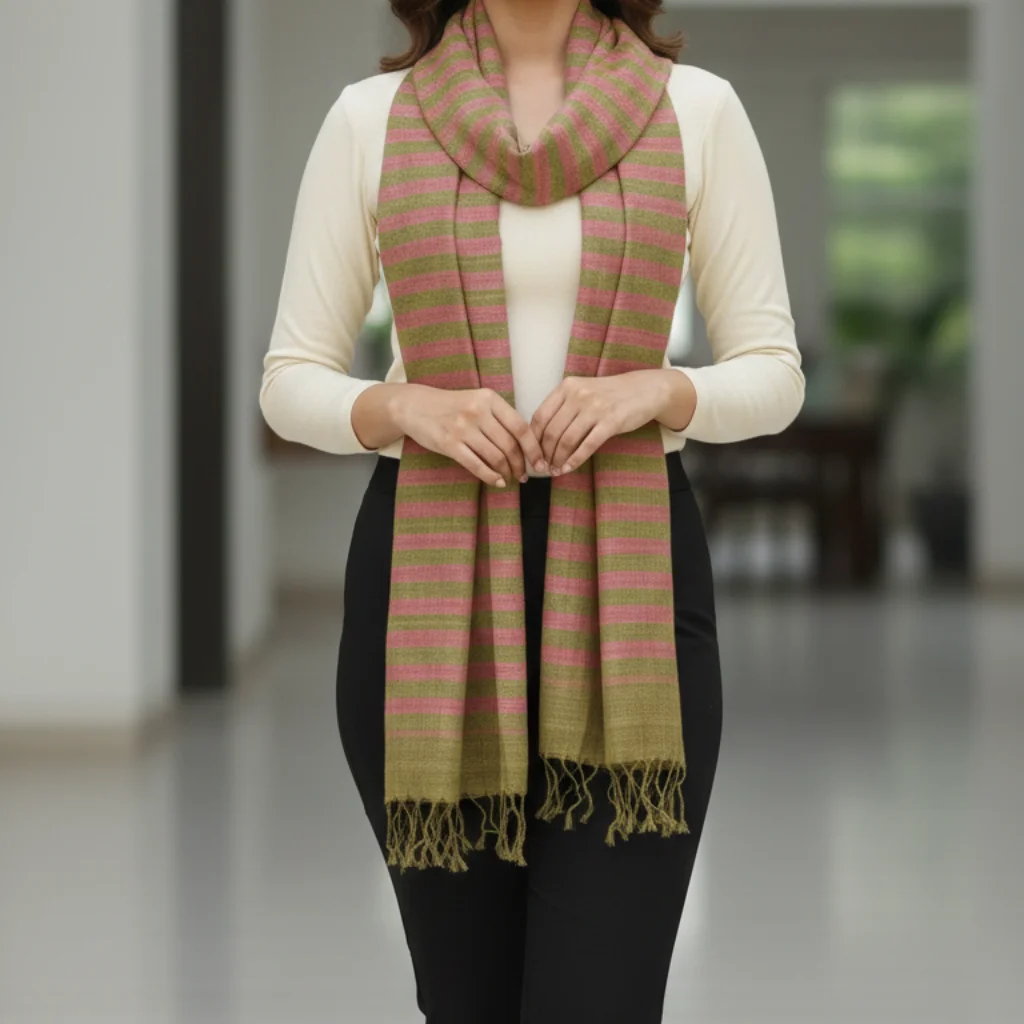 Soft as petals and elegant in appeal, this pure eri silk stole features soothing green and blush pink stripes that create a harmonious balance of nature-inspired tones. Handwoven with care, its lightweight texture and subtle sheen make it a perfect accessory for both everyday grace and refined occasions.