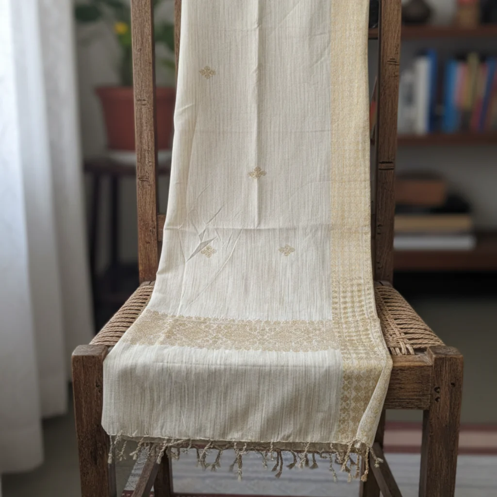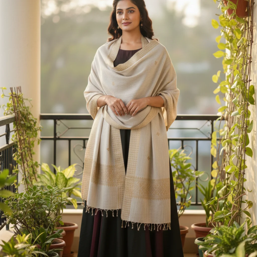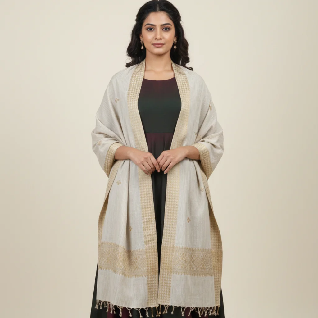 Rooted in heritage and woven by skilled artisans, this stole features a subtle geometric texture in earthy neutral shades. Lightweight yet cozy, it adds refined charm to both ethnic and contemporary outfits.