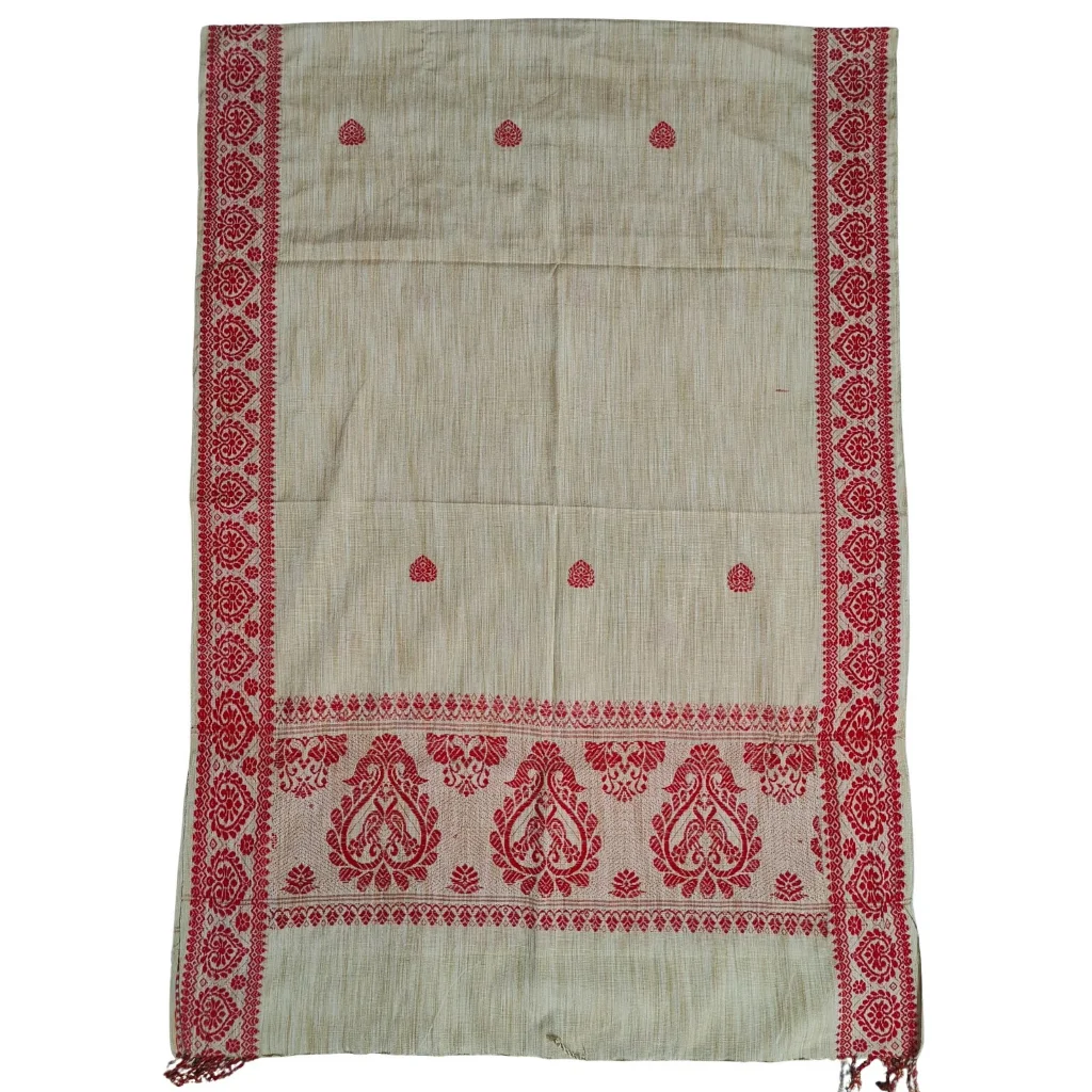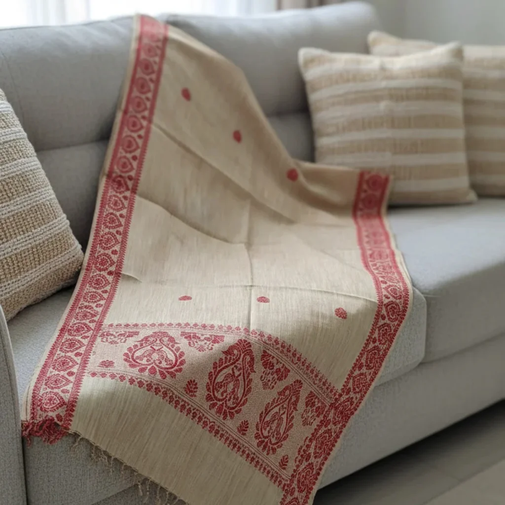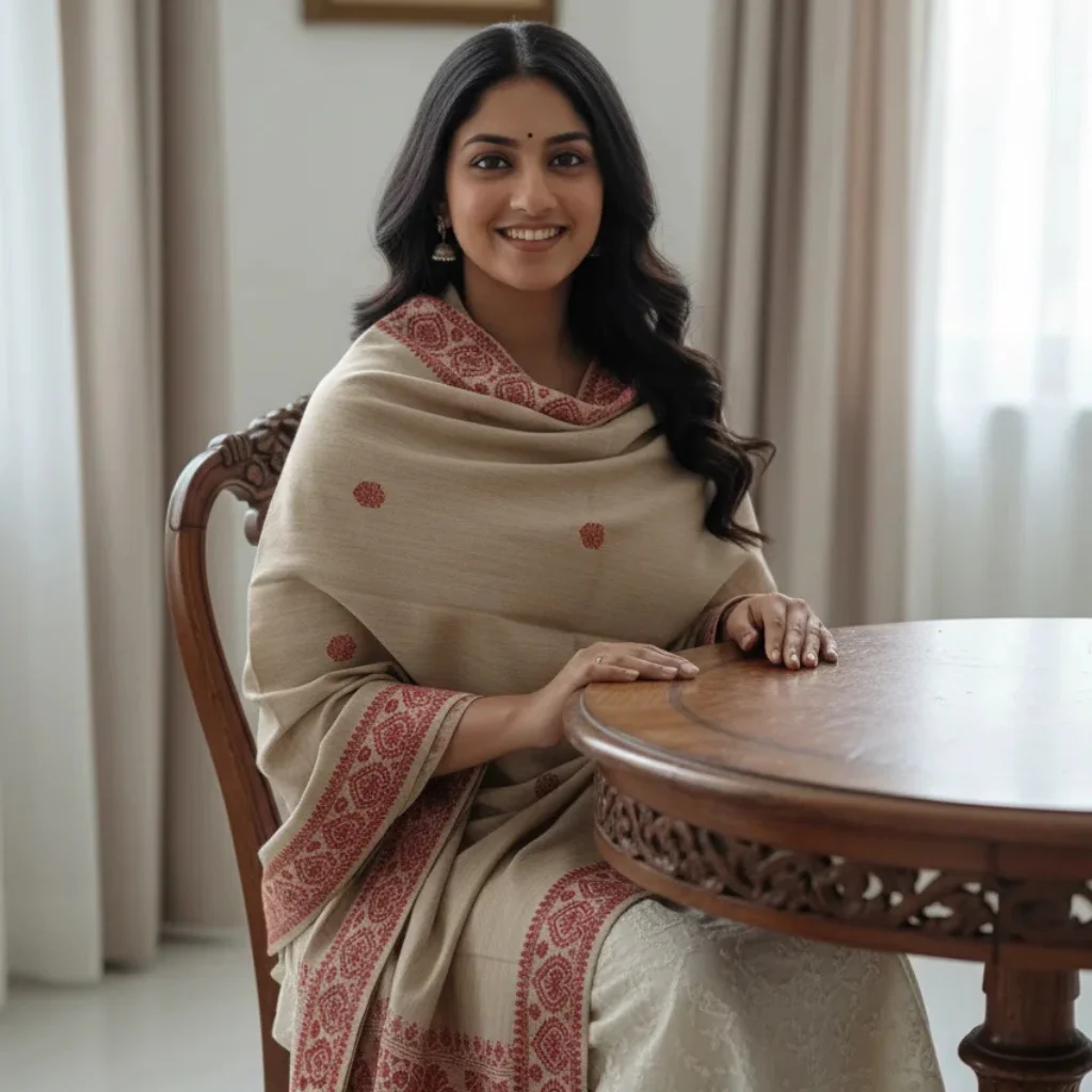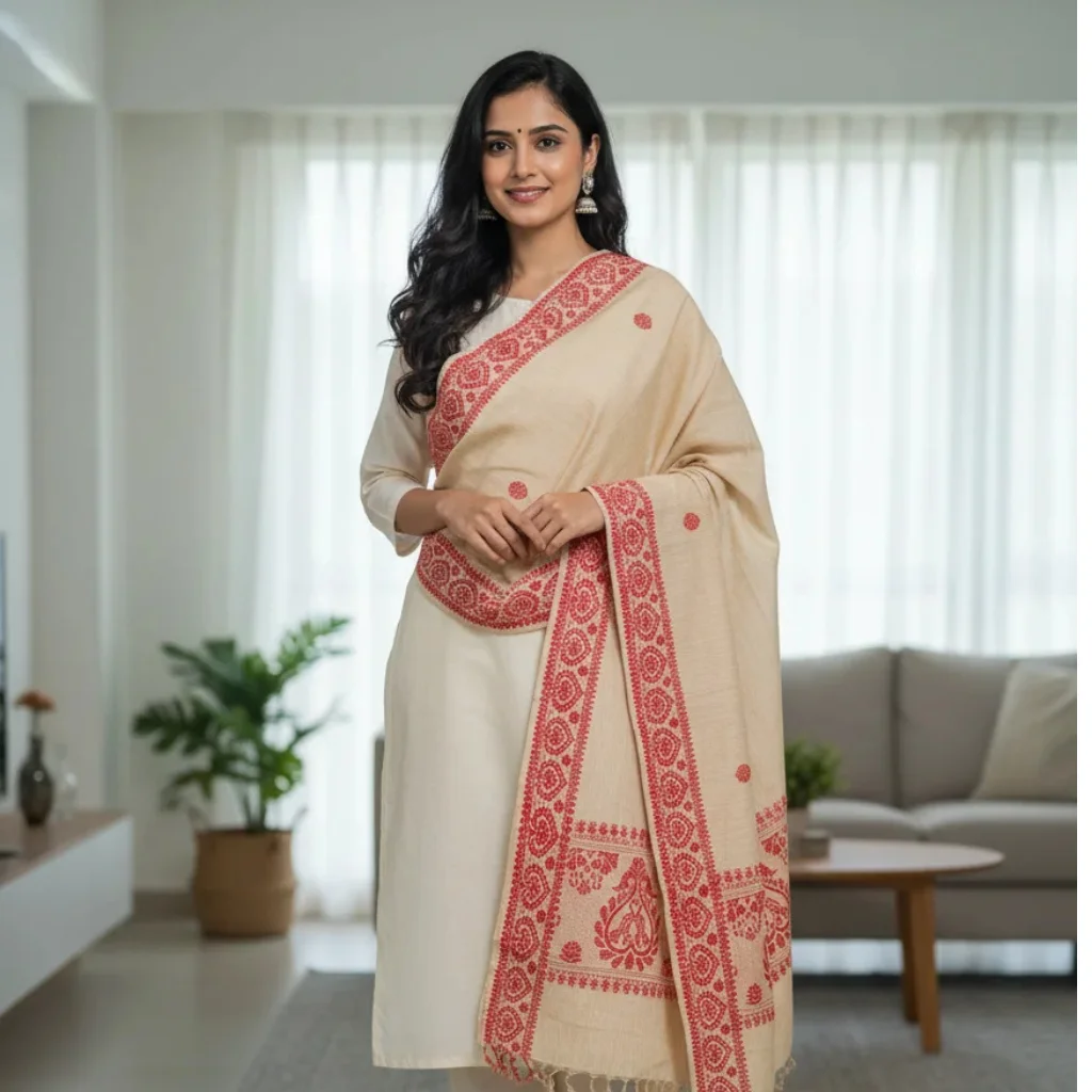 Elevate your look with this elegant handwoven stole featuring a calm neutral base and vibrant kumkum-red detailing. Soft to touch and rich in character, it’s designed for those who appreciate heritage with modern grace.