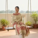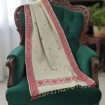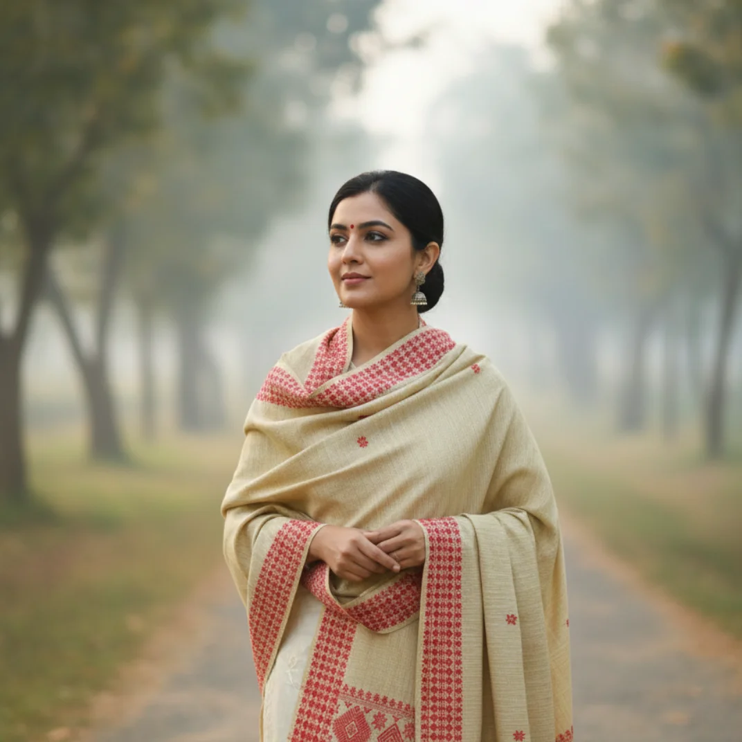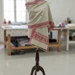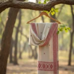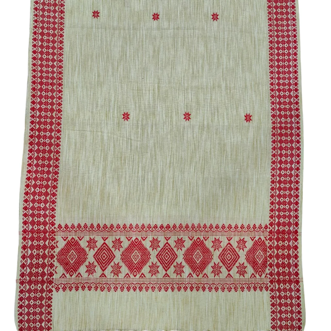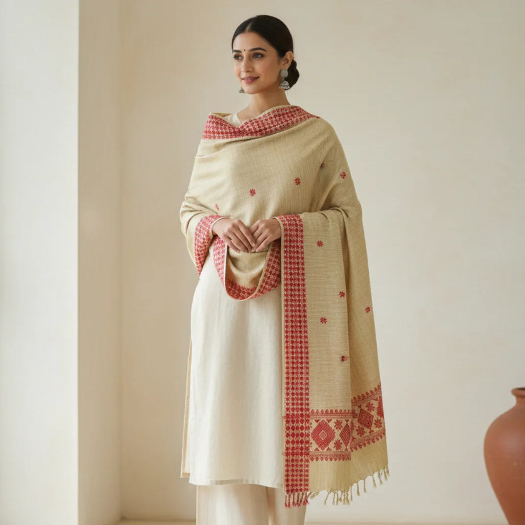 Inspired by celebratory hues, the Utsav Dhara Stole showcases a calm neutral body framed with intricate red tribal side borders. The decorative pallu with geometric patterns enhances its handcrafted appeal, making this stole a versatile accessory for ethnic and fusion styling.