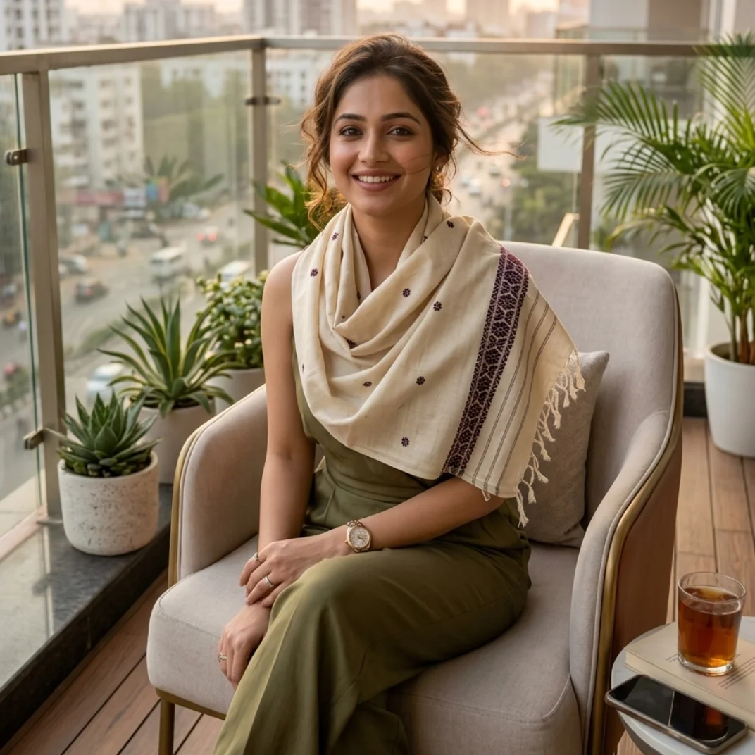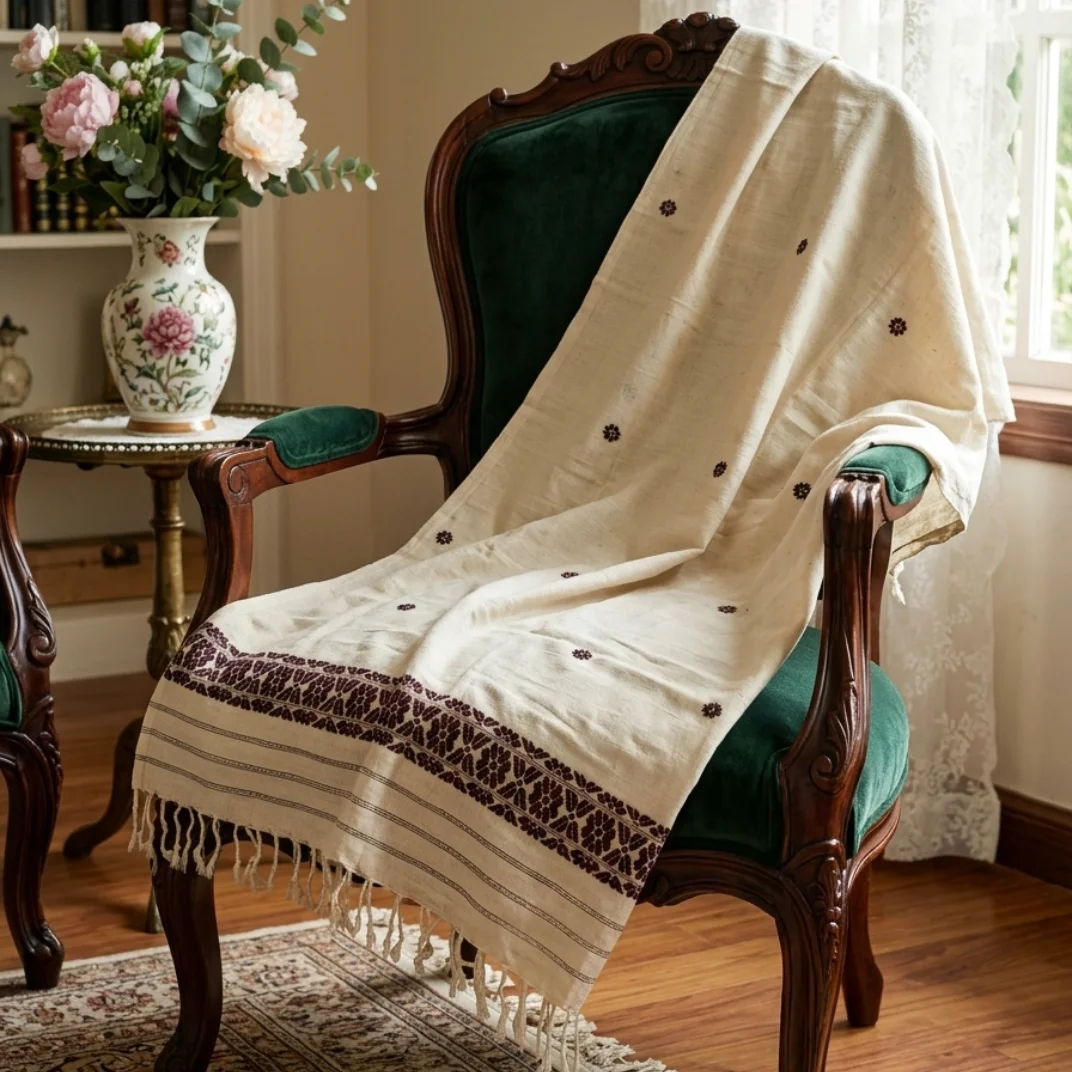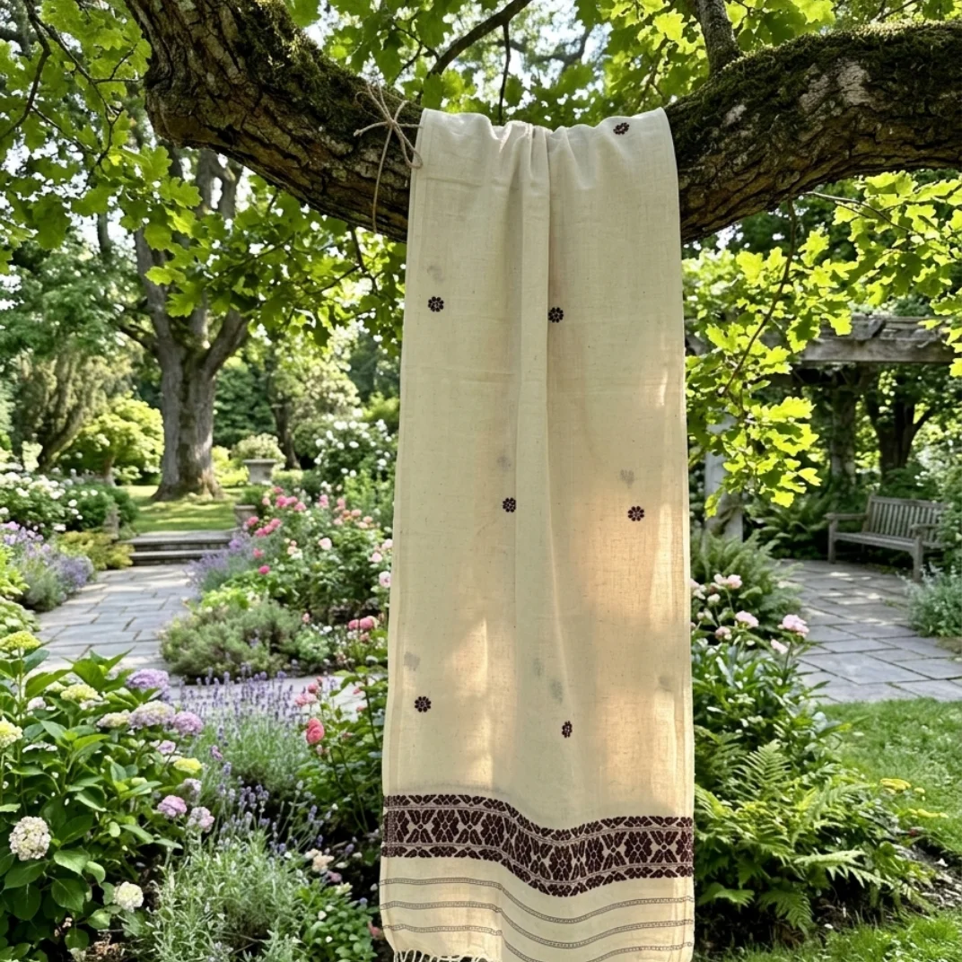 Rooted in tradition and nature, the Vanashree Heritage Shawl reflects timeless craftsmanship with its subtle motifs and intricate border design. Its soothing tone and soft handloom texture make it perfect for both casual and festive wear.