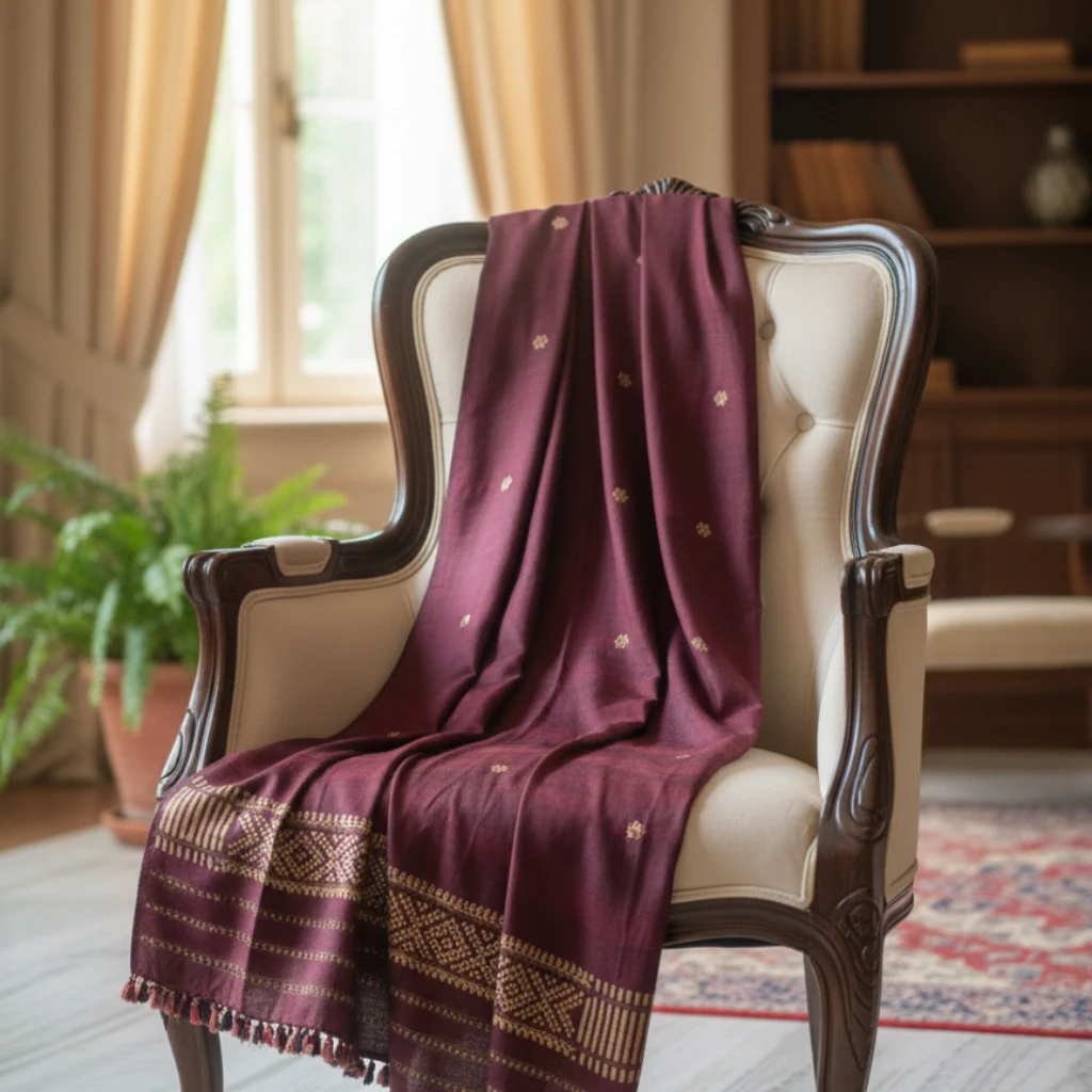 Wrap yourself in the subtle sophistication of Ruby Woven Whisper, a luxurious handloom Stole that fuses tradition with understated opulence. Woven from a rich maroon silk blend, this elegant piece features delicate golden zari work in a checkered diamond motif—symbolizing harmony and regal symmetry.